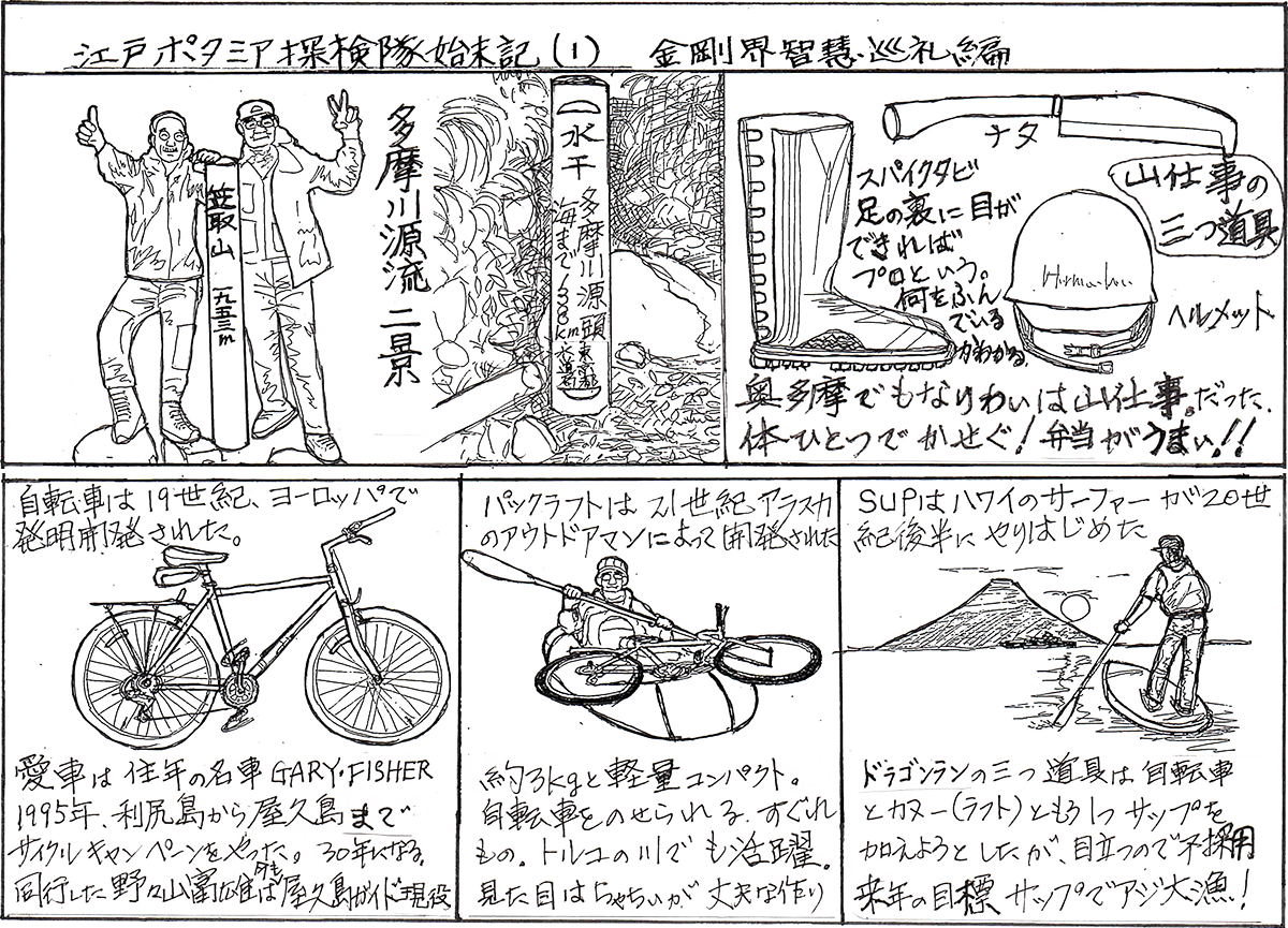 ◆2010年代になりいくつかのノンフィクション賞を取ったりしてすっかり売れ子になった高野は、「忙しいか?」「忙しいです」に変わった。中島みゆきの「悪女」の歌詞みたいに「あの子もわりと忙しいようで、そうそう付き合わせてもいられない」でエドポタミア探検隊の荒川、多摩川鍛錬計画に来られないことが多く、偵察と称して荒川は一度、多摩川は二度、一人ドラゴンランをやった。ドラゴンランは川の最源流の山から海まで、徒歩、自転車、カヌーなどの人力だけで踏破する行為に名付けたもの。忙しい高野は部分的に参加した(ちなみに川を続けて航行するのはドラゴンヴォヤージュとして世界一周計画を立てていた。ナイルはその途上だった)。