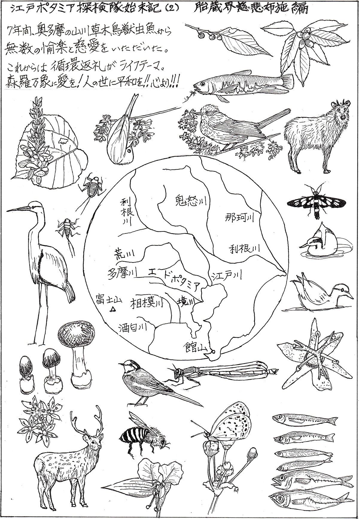 ◆館山に来たのは、このエドポタミア探検隊の始末をつける意味もあり、次なるステップへの飛躍点でもある。縄文時代より前、2万年前の氷河期、海岸線は今より100m以上下り、荒川には利根川と多摩川が、干上がった東京湾で合流して館山あたりで太平洋にそそいでいたらしい。そう、ここは「エドポタミア探検隊」に始末をつけるには、またとない場所なのだ。館山の山は椎や樫などの照葉樹林が優先し海中にはサンゴも見える。何より鏡ヶ浦の向こうに富士山が望め、夕陽時のシルエットの絶景が縄文時代と変わらず人々を癒している。そして今「水と森の地球巡礼88景」を構想している。この始末記はその0号でもある。[山田高司]