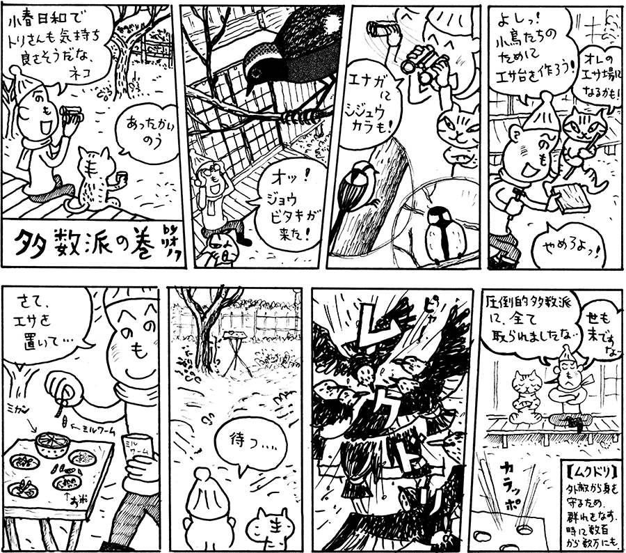 ■久しぶりに画伯の8コマ漫画を見て、たまに報告会おやすみも悪くないな、と思った。ハングルで書かれている文字は「地平線通信 五百六十二」の意味。何気ない数字もデザイン化してしまう画伯の腕にいつもながら感心する。そして、エナガやシジュウカラが来る庭は紛れもなく懐かしい長野家の庭でこういうスケッチも嬉しい。
